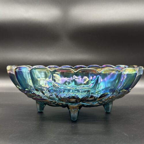 Vintage Blue Carnival Glass Iridescent Finish Large Footed Oval Fruit Bowl