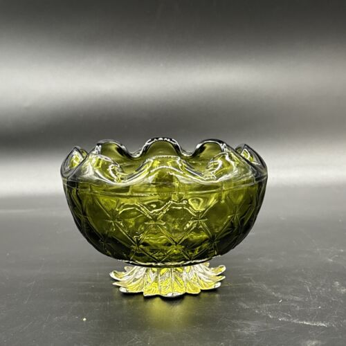 Indiana Glass Co Avocado Green Diamond Point Bowl Pedestal Candy Dish Vintage