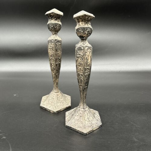 E.& J. B. Dutch Silver Motif Candle Stick Holders 10" Antique Pair