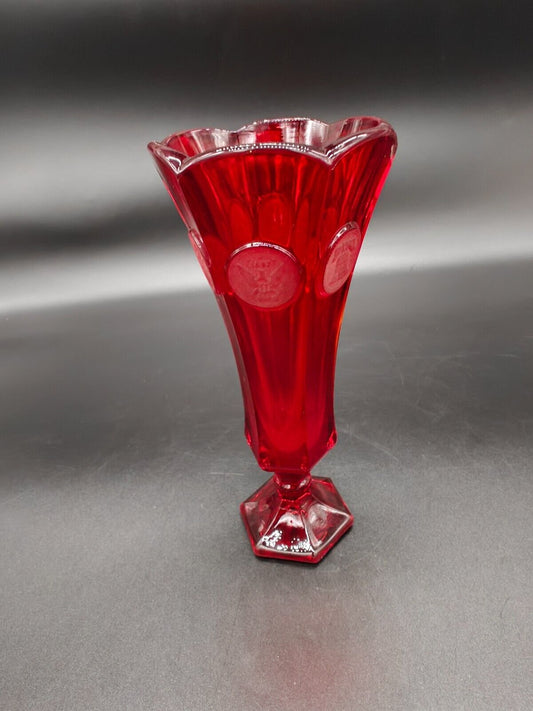 Vintage Fostoria Ruby Red Coin Footed Vase Eagle, Liberty Bell, Torch/Sunburst