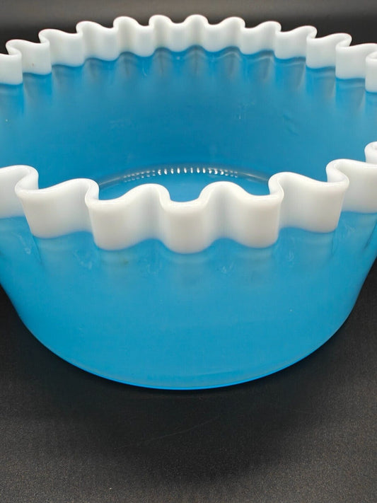 Vintage Hobbs Brockunier 205 Blue Glass Bowl with white ruffled edge
