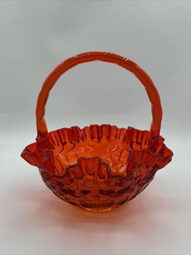 Fenton Amberina Red Orange Ruffled Edge Thumbprint Glass Basket 8" Vintage