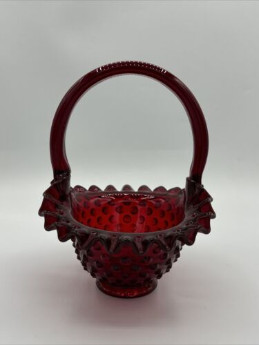 Vintage Fenton Hobnail Ruby Red Amberina Glass Basket 7.5" Tall